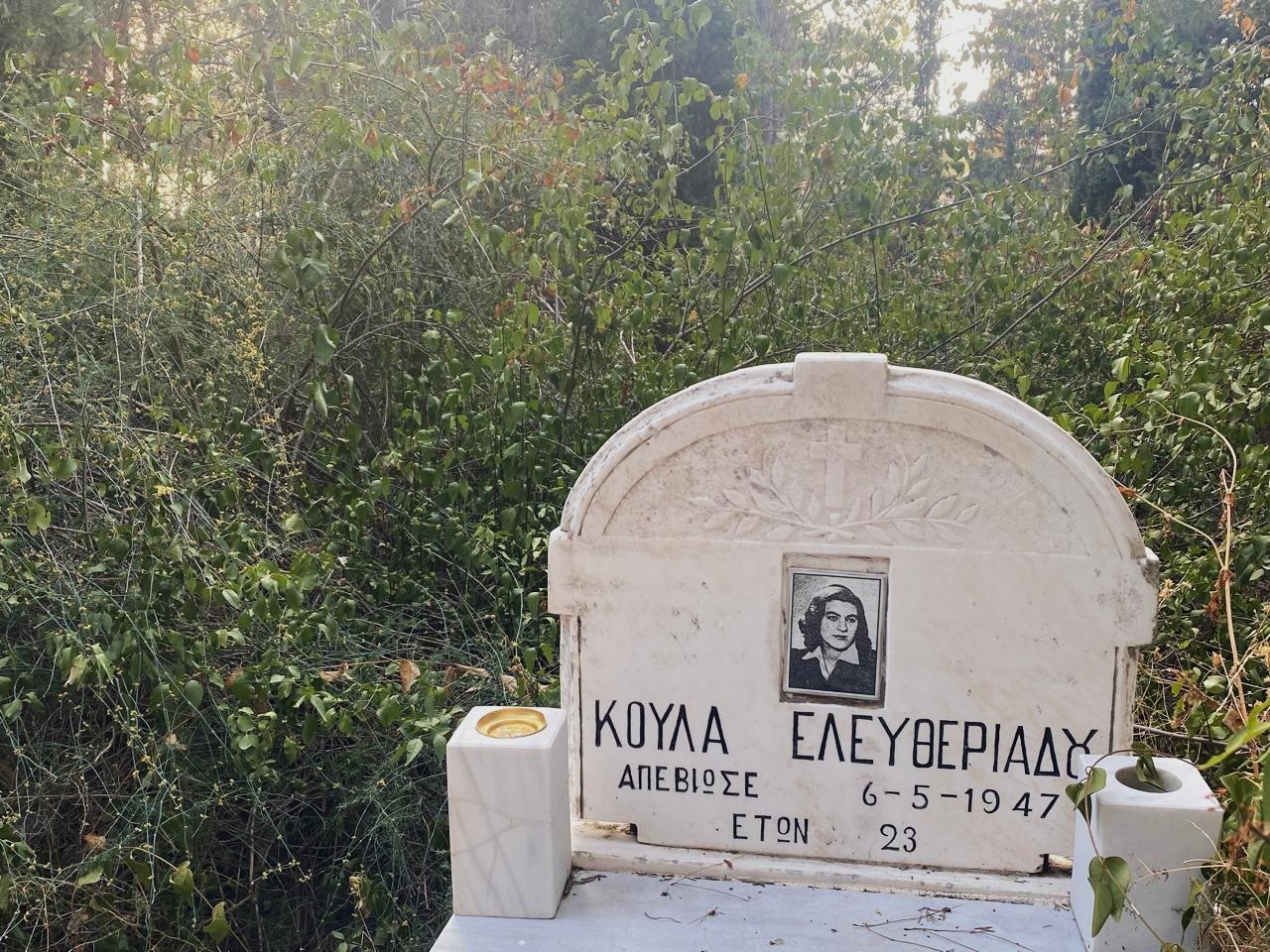 Amid the decay, one grave stood apart. Hidden deep in the forest, it was almost reverent in its secrecy: intact, carefully preserved, as if someone had quietly guarded it through decades. It belonged to Koula Eleftheriadou , a 23-year-old whose life was cut short by the turmoil of her time. Etched into the stone is her own defiant testament: