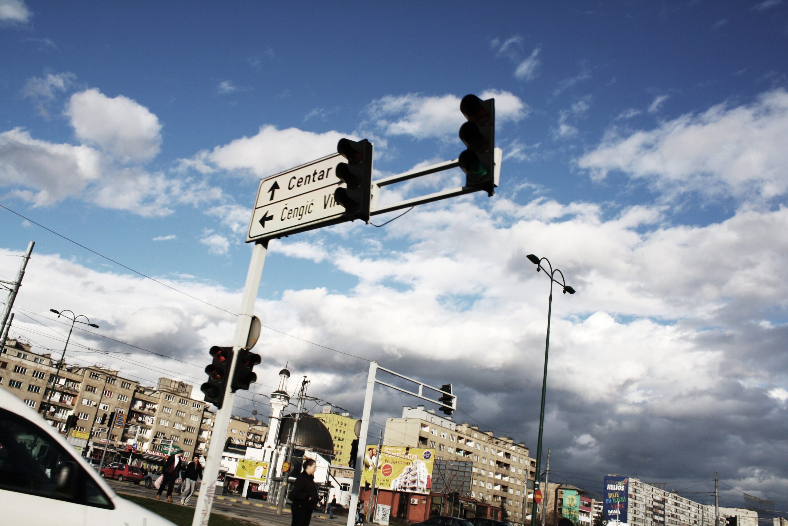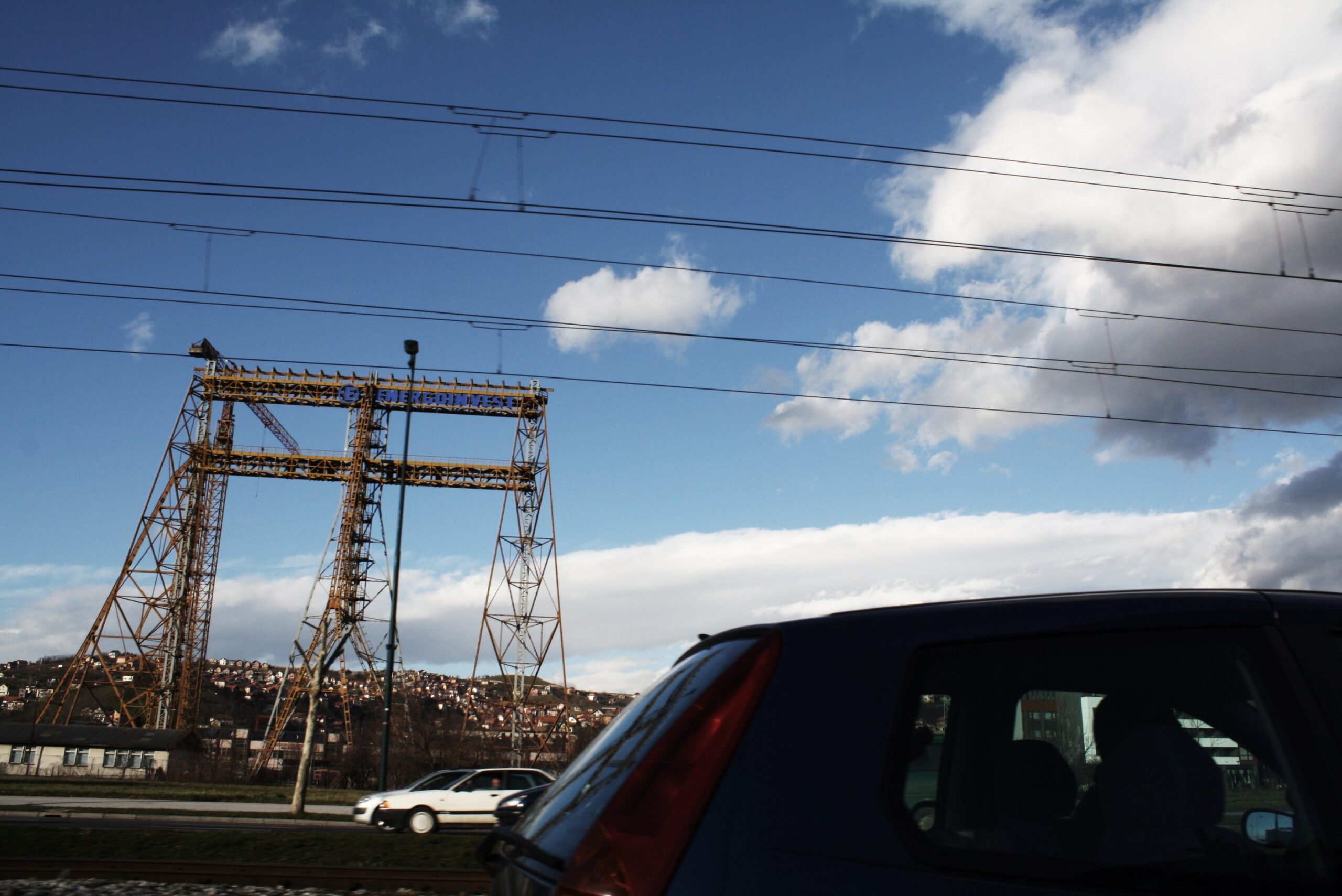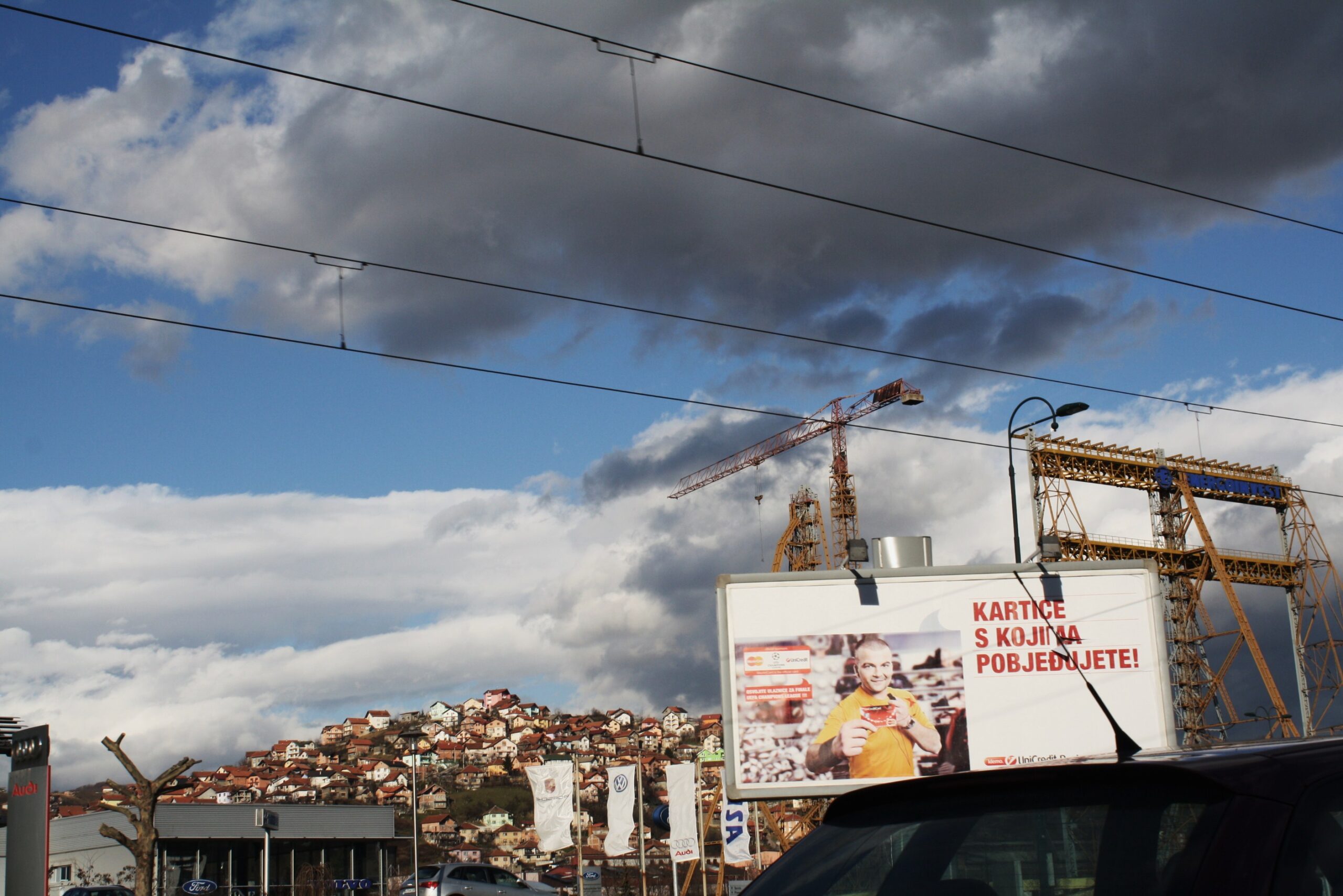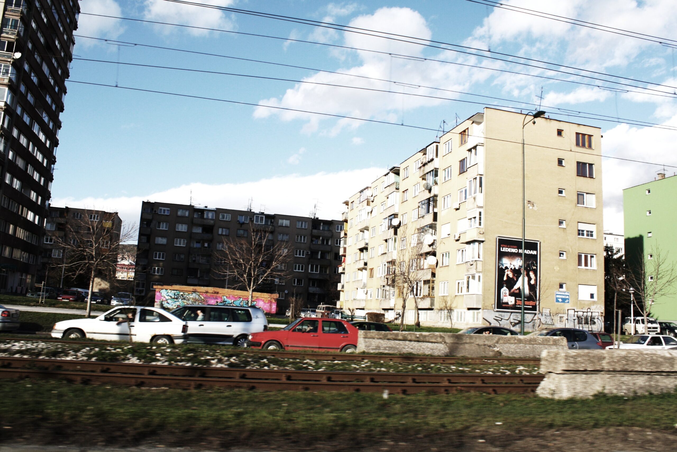 A broad, long, multi-lane street dotted with traffic lights crosses through Novi Sarajevo, by its skyscrapers, and beside small houses perched on the hills. Pictures by Anna Cavarzan.