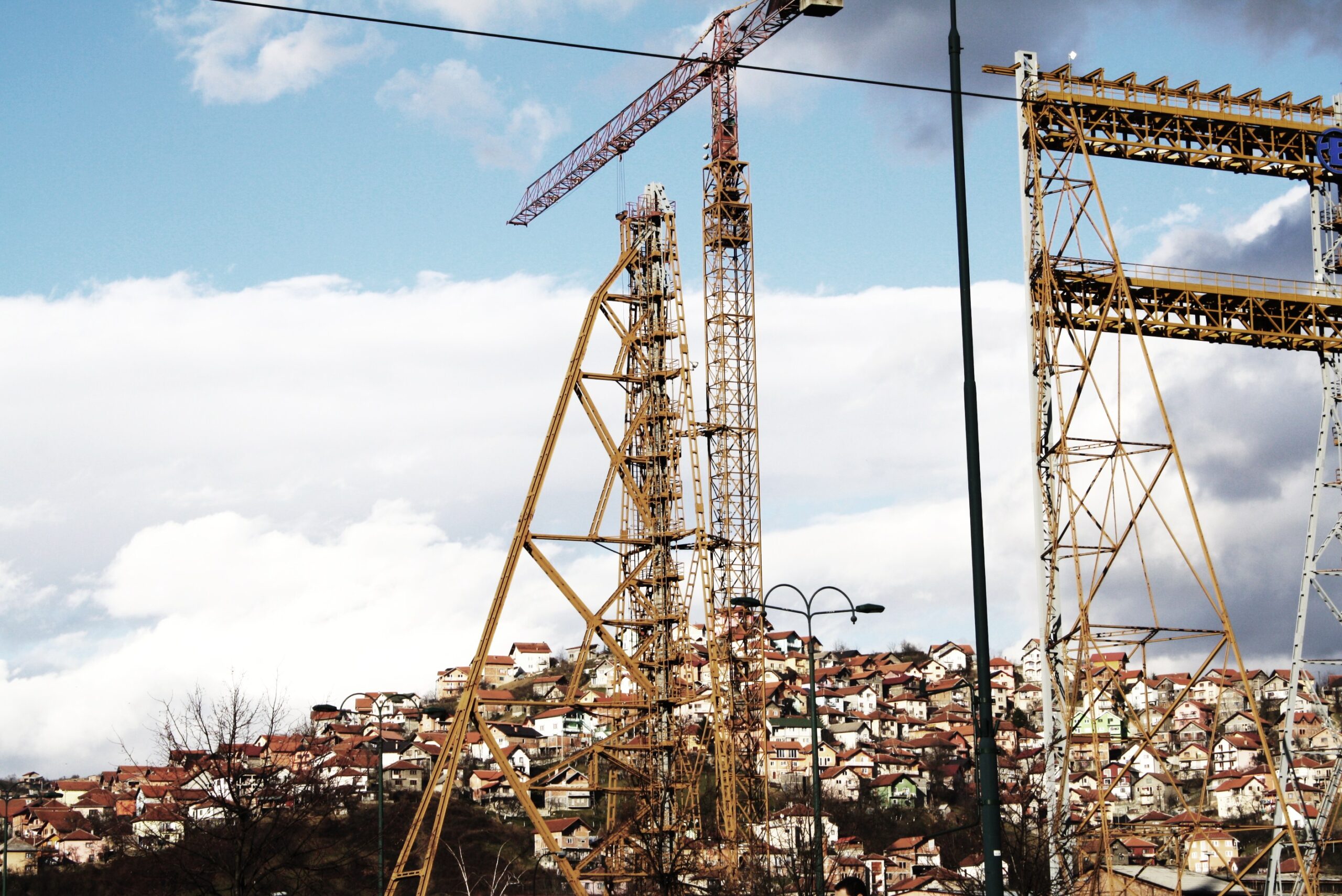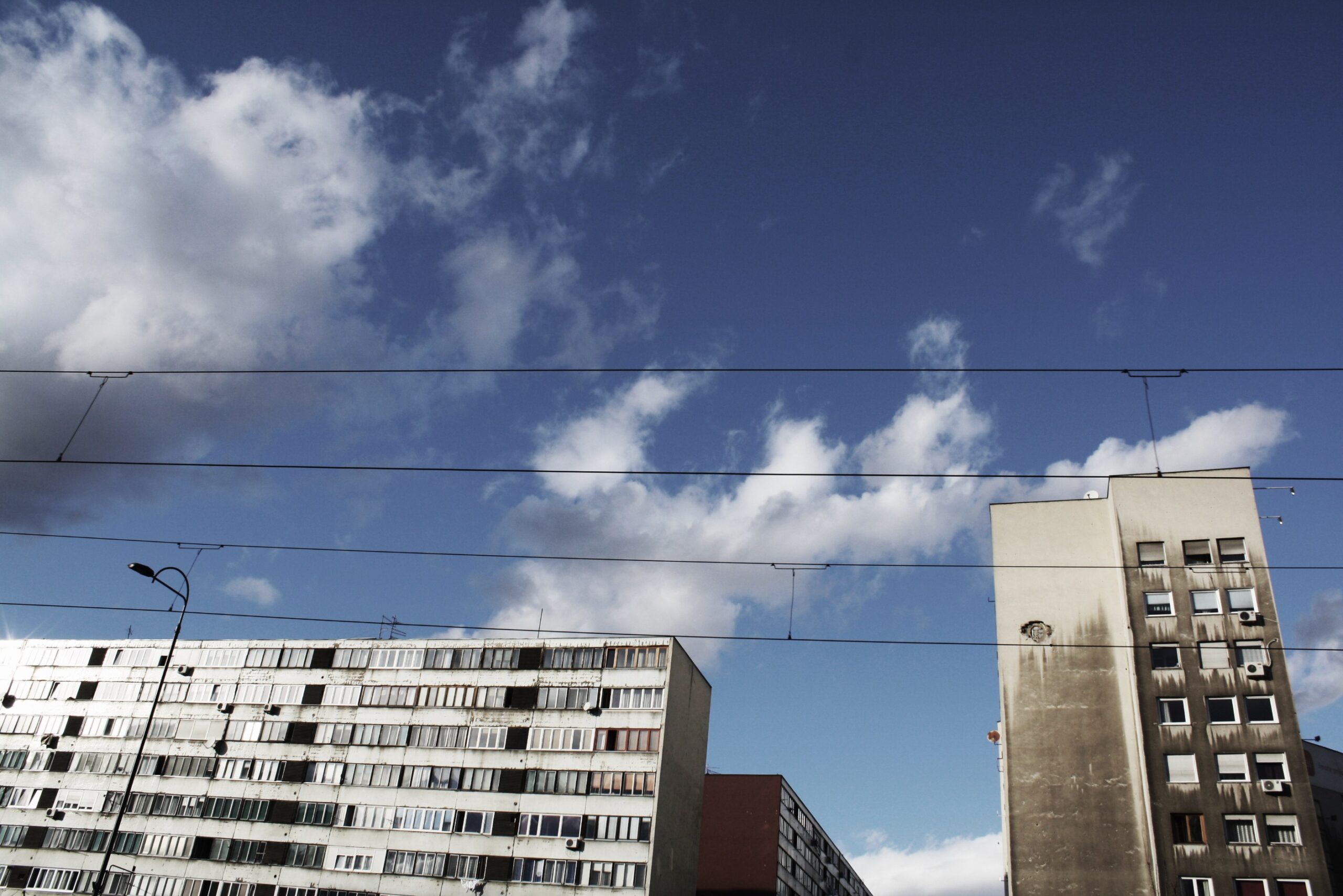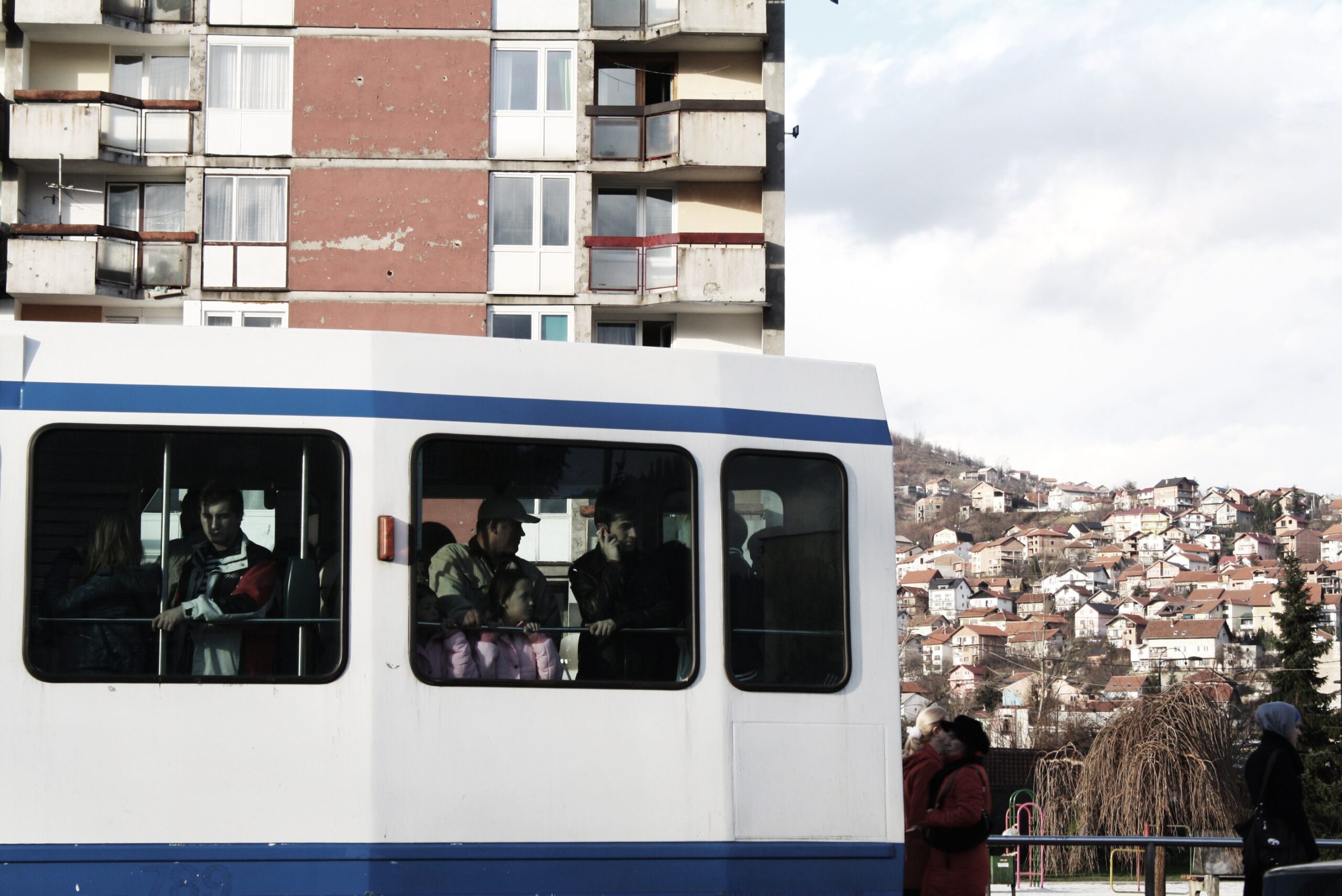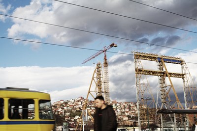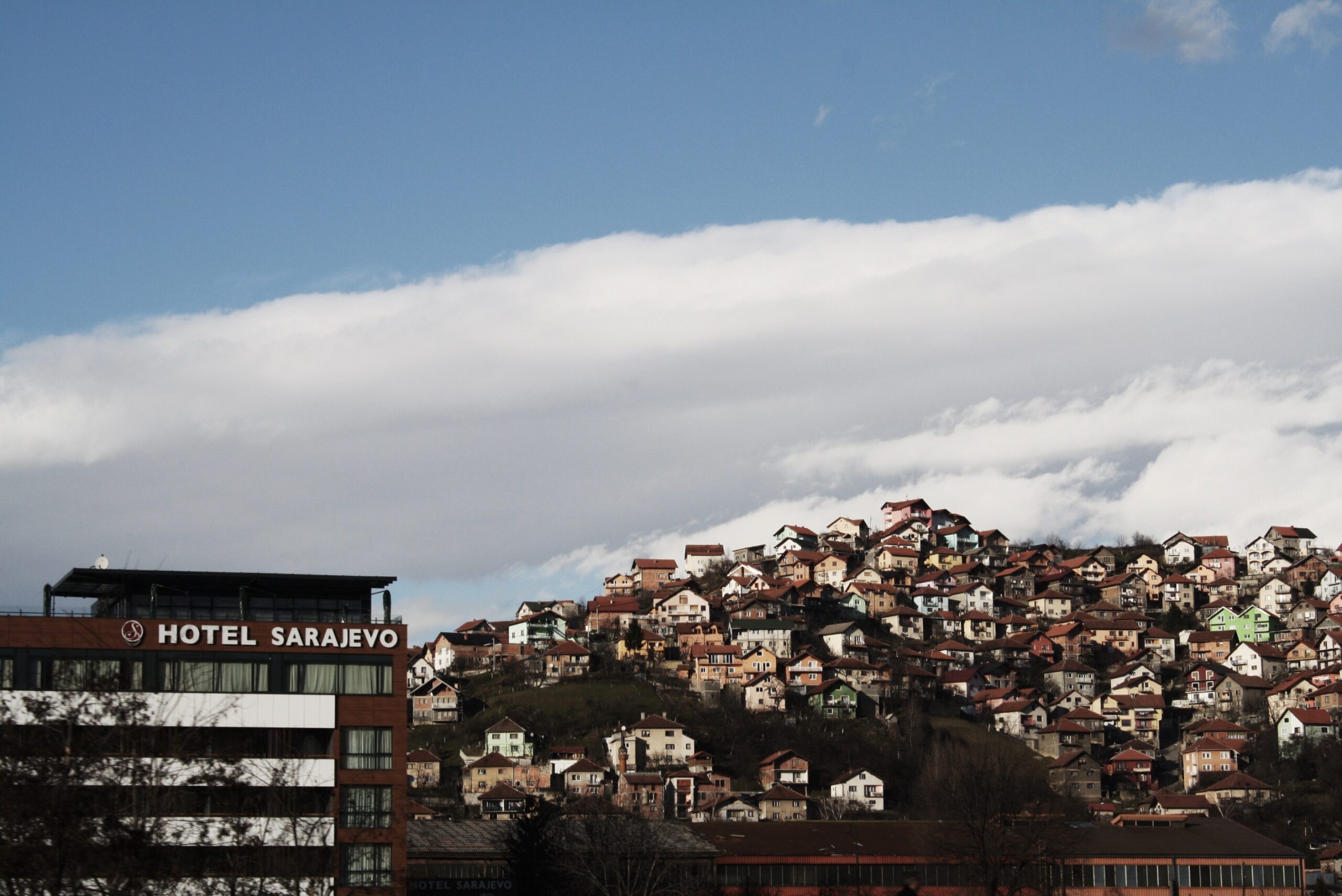 A broad, long, multi-lane street dotted with traffic lights crosses through Novi Sarajevo, by its skyscrapers, and beside small houses perched on the hills. Pictures by Anna Cavarzan.