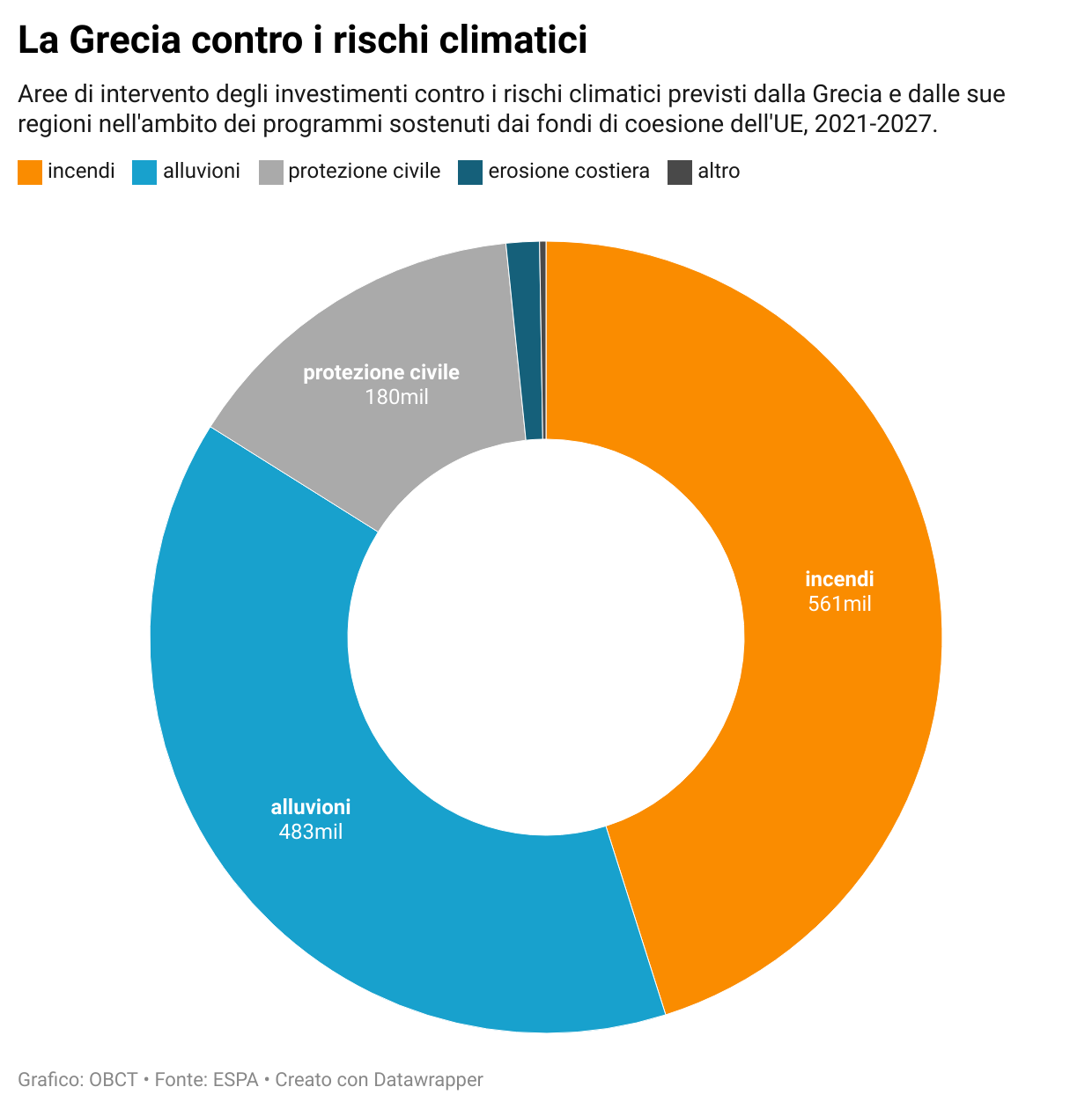 Of these, 45% concern combating fires. They are almost all projects focused on the purchase of aircraft, drones, trucks or other equipment for firefighters. Between 2014 and 2024, almost five thousand square kilometres of land burned in Greece – an area comparable to half of the Marche region. After Portugal, this is the highest percentage of burned land in Europe.
