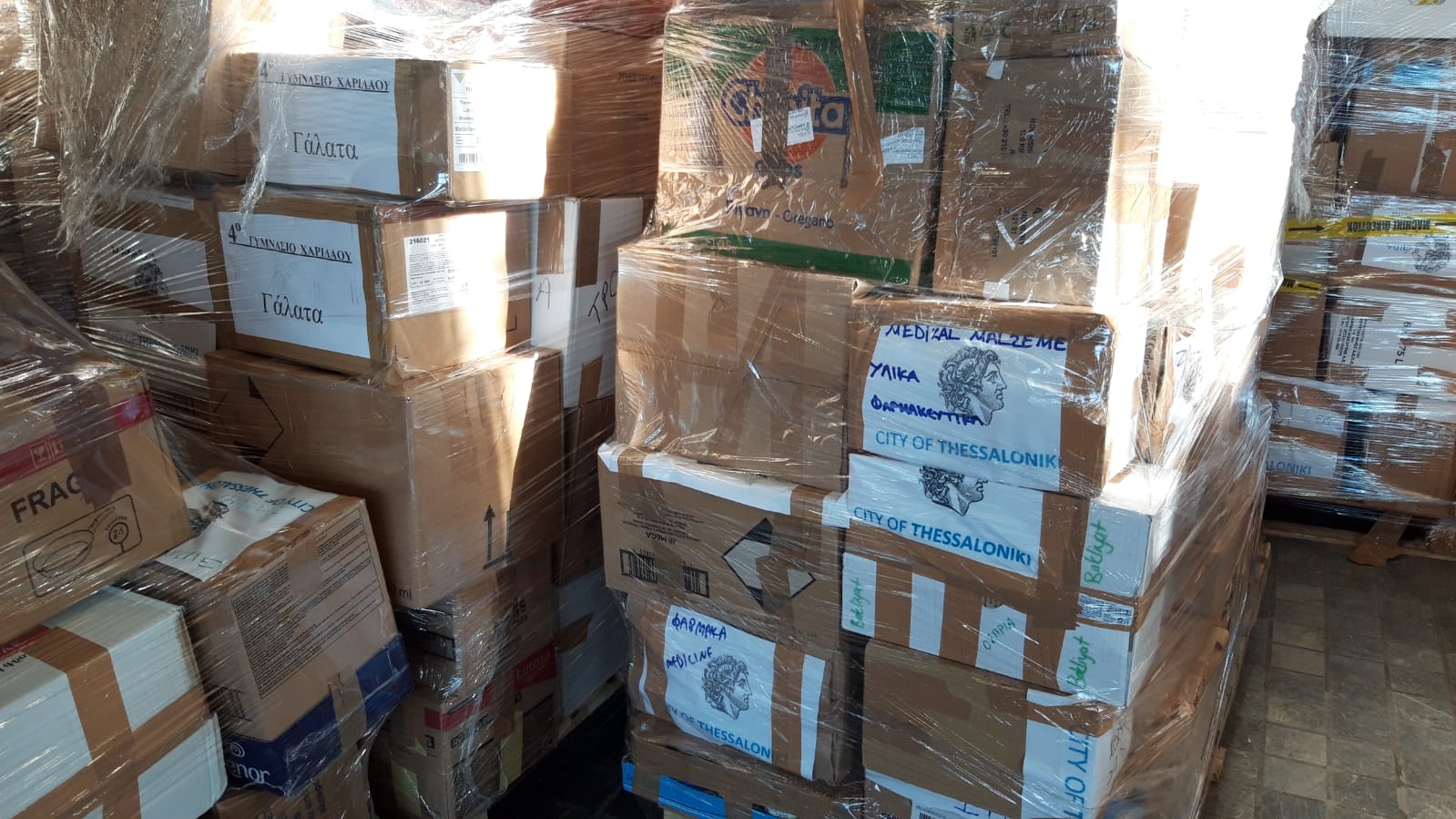 “Let me get that”, says a young male soldier, swiftly grabbing the carton from her hands and carrying it on his shoulders to the other side of the Foyer, where dozens of boxes of similar content are piling up. The City Hall of Thessaloniki has turned into a warehouse where hundreds of boxes containing clothes, food, and medical supplies are being stored. Every five or ten minutes another car stops outside the side entrance and ordinary people unload plastic bags, suitcases, or cardboard boxes containing humanitarian aid. The volunteers receive the donations and categorise the contents per item.