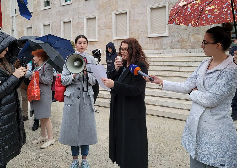 Investigative journalist Aurora Velaj urged her colleagues to gather in front of the Prime Minister’s office, reiterating the growing danger to press freedom in the country and the importance of being present in solidarity also for those who, for fear of repercussions at work, cannot actively participate.