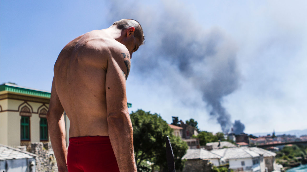 It went like this: I was on vacation, I was doing a tour of Bosnia, and after Banja Luka and Travnik I arrived in Mostar. One of the first scenes I saw was this guy looking down from the bridge – the same scene you see in the preview. While I was watching him, I heard a man speak in Italian and I approached him to ask for some information. I already knew the history of the bridge and was vaguely aware of the tradition of diving, but not much. Over coffee and a cigarette I made friends with Mustafa, who then became a very important figure throughout the documentary-making process.
