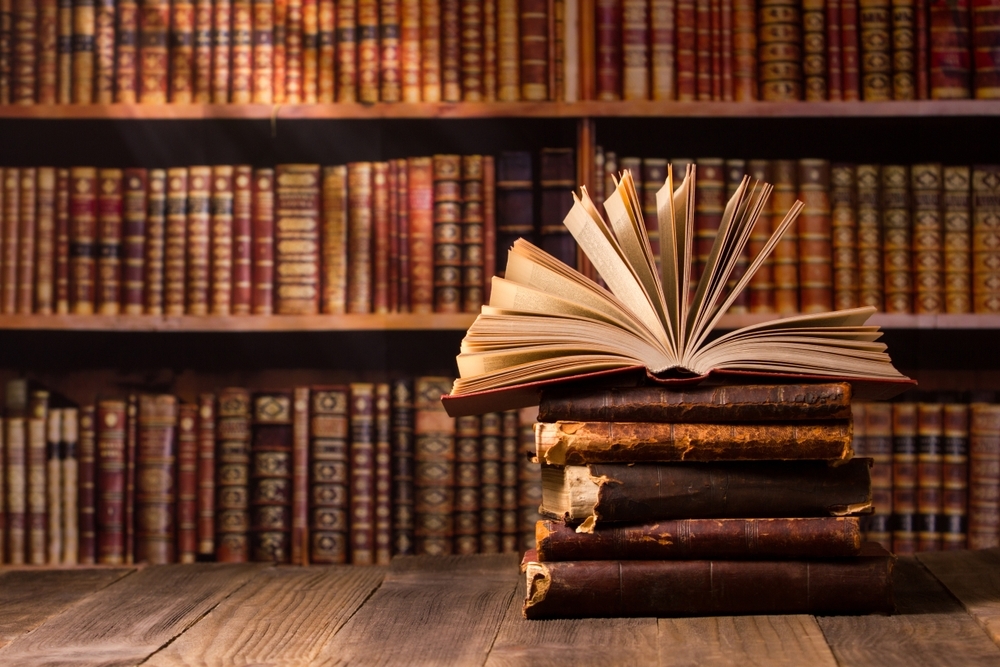 Vintage old hardback books, fanned pages on wooden desk table. © 83054/Shutterstock