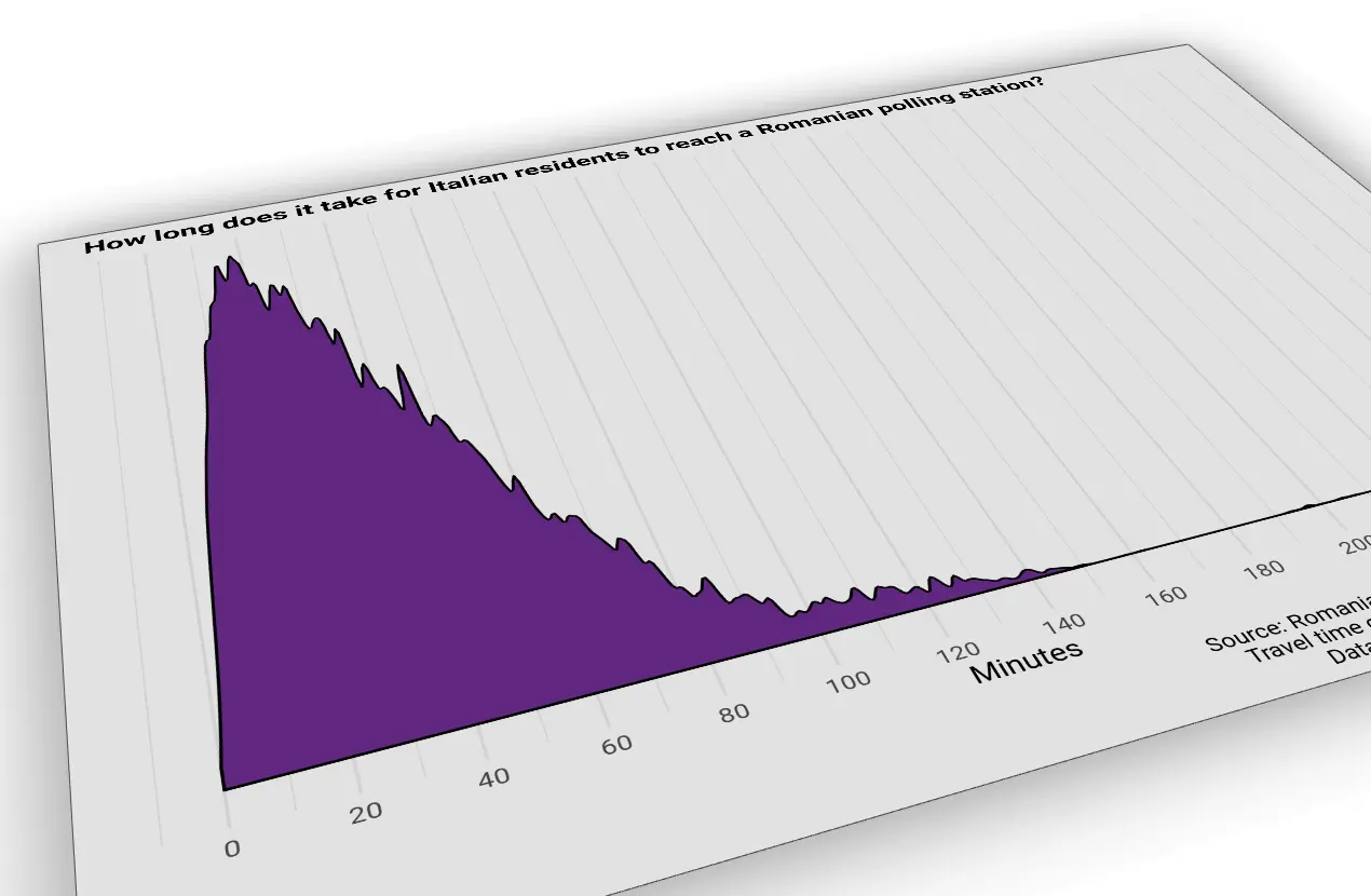 In order to gauge how close the average resident of Italy lives from a Romanian polling stations, we have calculated the distance between each polling station and each inhabited location of Italy, weighting the result according to the number of residents of each location (Eurostat publishes a dataset with figures on how many people live in each square kilometer of the continent: there are about 172.000 cells in Italy’s population grid). After a computing-intensive process (whose details are outlined here ), it emerged that Italians live on average about 18 km – as the crow flies – from a Romanian polling station; more than 50 per cent of Italians live less than 13 km from one. Even considering the actual estimated driving distance and time, the result is quite impressive: on average, Italians would need to drive about 40 minutes to reach a Romanian polling stations. Half of Italians could reach one in less than 35 minutes, and an overwhelming majority in less than one hour. Considering that migrants are more likely to live in urban centres rather than in remote locations, the actual figures for the average Romanian citizen living in Italy are likely significantly lower. It is true that some Romanian citizens likely live in locations that are more than two hours by car from a polling station, but, after all, this time voting by correspondence was also available to Romanian citizens living abroad.