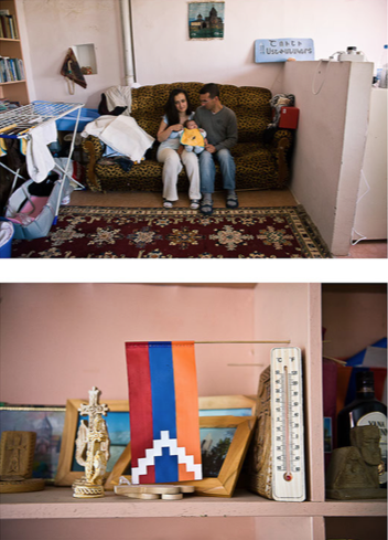 Armen and Cristina Rakedjan (Popa) on their sofa in Shushi with their 40 day-old daughter. They decided to marry in Ghazanchetsots cathedral in 2010 after having met each other on Facebook a few months earlier. He is originally a French citizen and she is Romanian but both, when they discovered their Armenian origin, felt they had to learn Armenian and go back to their homeland. Armen arrived earlier, in 2004, following the repopulation program, but discovered that it was mostly directed to Armenian citizens moving to NKR.