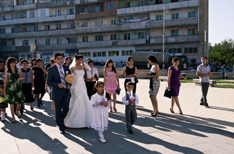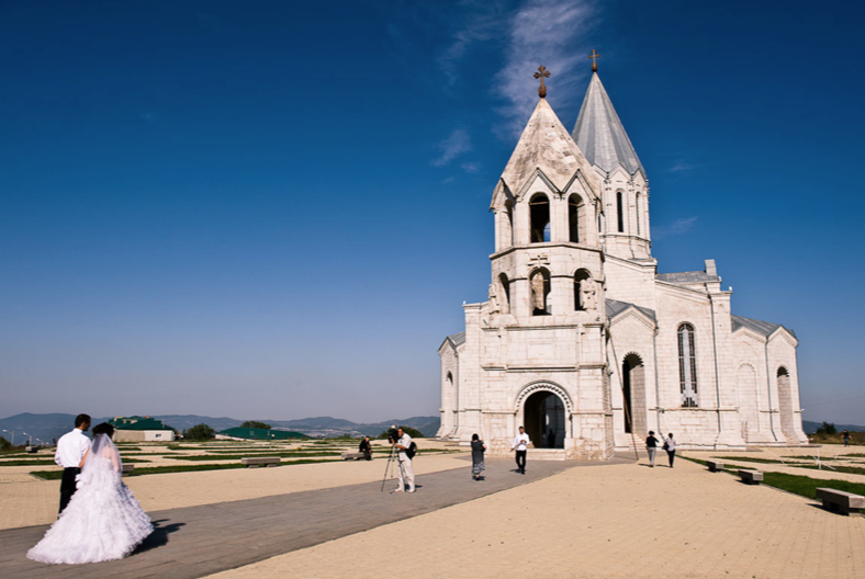 A wedding couple poses on the way to the Ghazanchetsots cathedral. During the war the cathedral was used by Azerbaijani forces as a safe store for Grad missiles used against Stepanakert.