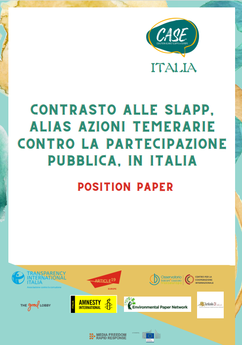 Le SLAPP (Strategic Lawsuits Against Public Participation), alias “azioni temerarie” o “cause bavaglio”, costituiscono una forma di abuso del diritto che mira a limitare l’esercizio della libertà di espressione. Le SLAPP rappresentano un fenomeno diffuso in tutto il continente europeo e con manifestazioni transfrontaliere. In Italia, il fenomeno si contraddistingue per un numero elevato di azioni o querele temerarie intentate da politici e figure pubbliche di alto livello, nonché enti di diritto pubblico e imprese spesso multinazionali, e per una legislazione problematica, che favorisce chi avvia le SLAPP e il loro stesso uso. L’obiettivo di questo position paper è quello di esaminare l’impatto del fenomeno delle SLAPP in Italia e contestualizzarlo nel panorama europeo, avanzando delle soluzioni concrete che vadano a vantaggio dei cittadini e della partecipazione pubblica.