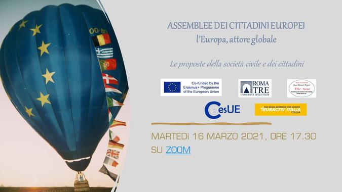Le Assemblee dei cittadini europei sono organizzate nell’ambito del progetto Jean Monnet EU2-You Too dell’Università di Roma Tre, in collaborazione con il CesUE e con EURACTIV Italia. L’appuntamento si svolge nella piazza virtuale di ZOOM, per parlare questa volta del ruolo dell’UE nella dimensione globale.