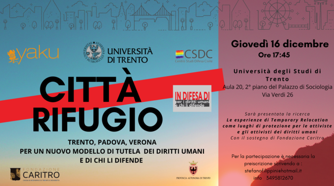 L’evento del 16 dicembre, ospitato dall’Università di Trento, nella sua prima parte presentarà il lavoro della ricercatrice Marzia Deflorian, al tempo collaboratrice dell’associazione trentina Yaku: “Le esperienze di Temporary relocation come luoghi di protezione per le attiviste e gli attivisti dei diritti umani. Linee guida per la creazione in Trentino di una Città In Difesa Di per difensore dei diritti umani minacciate”, che grazie alla supervisione scientifica del Centro Studi Difesa Civile e alla guida accademica dell’Università degli Studi di Trento, ha permesso di indagare e raffrontare i principali programmi di protezione per Human Rights Defenders (HRD) in Europa, ed aiutare così la costruzione di linee guida utili per territori ed istituzioni italiani.