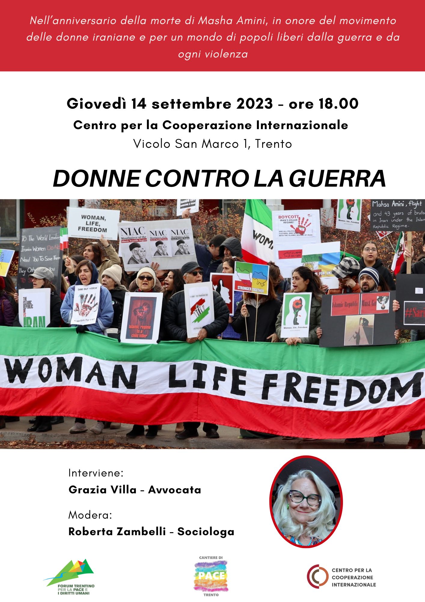 Nell’anniversario della morte di Masha Amini e in onore del movimento delle donne iraniane, la sociologa Roberta Zambelli del Centro per la Cooperazione Internazionale dialogherà con l’avvocata Grazia Villa, per un momento di informazione e riflessione sui movimenti delle donne contro la guerra.