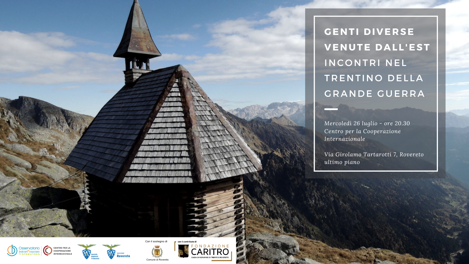 L’Osservatorio Balcani Caucaso Transeuropa del Centro per la Cooperazione Internazionale con la collaborazione della sezione SAT di Rovereto e della Commissione Storico Culturale e Biblioteca SAT, propone un incontro durante il quale il ricercatore e storico Marco Abram ci guiderà alla scoperta dei luoghi che sulle montagne e nelle vallate trentine portano il segno del passaggio dell’Altro in tempo di guerra.