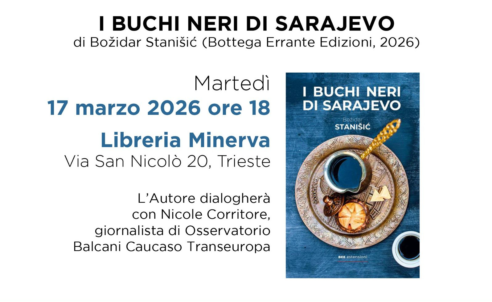 Nel 30° anniversario della fine dell’assedio di Sarajevo, viene presentata la nuova edizione del libro di Božidar Stanišić edito da Bottega Errante. L’autore dialogherà con Nicole Corritore, giornalista di OBC Transeuropa