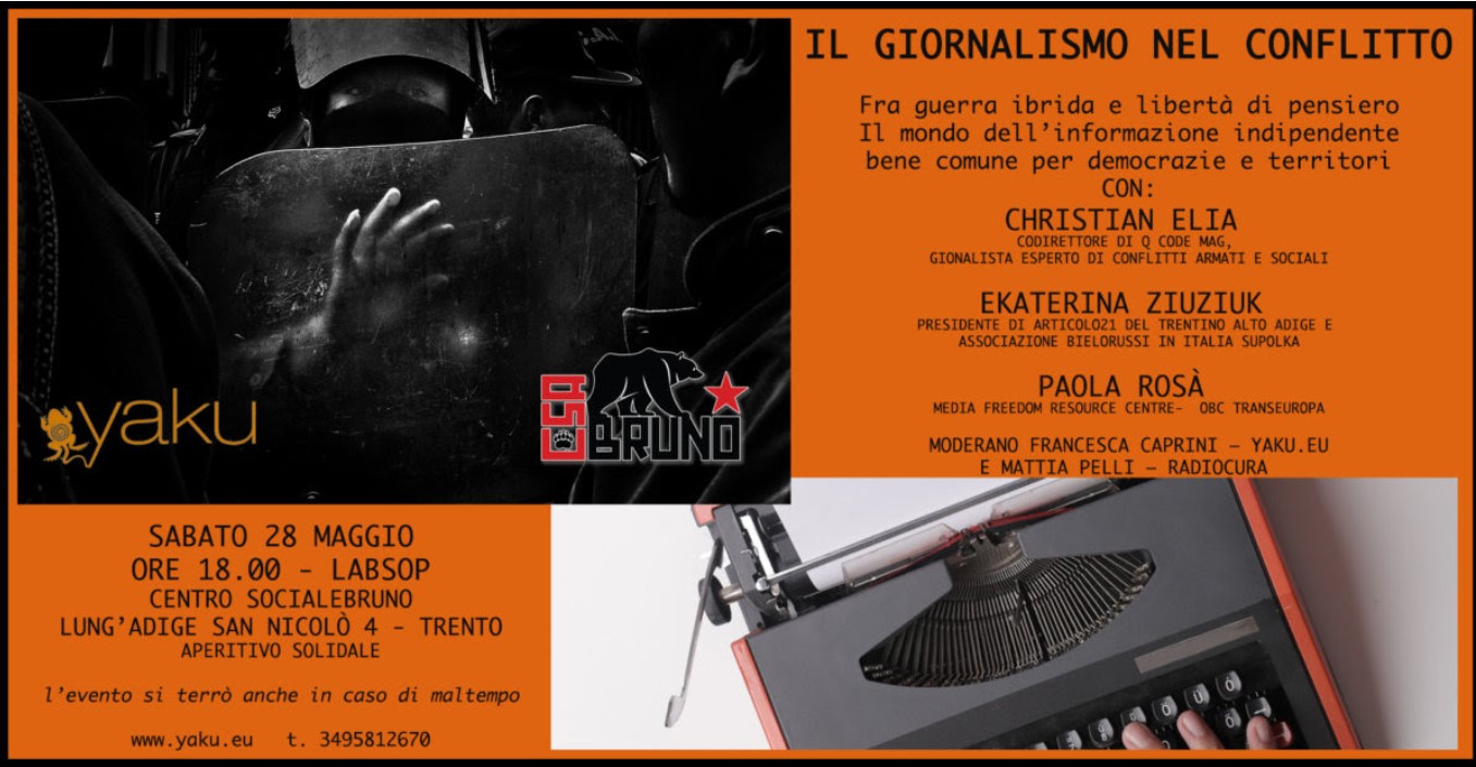 Insieme ai giornalisti Christian Elia, per anni inviato di PeaceReporter ed esperto di Medio Oriente, Balcani e Mediterraneo, Ekaterina Ziuziuk, presidente di Articolo21 del Trentino Alto Adige e dell’Associazione bielorussi in Italia ” Supolka”, e Paola Rosà, coordinatrice del Media Freedom Resource Centre gestito da OBC Transeuropa, ragioneremo sul ruolo necessario dell’informazione indipendente anche in tempo di guerra, e sulla sua crescentecriminalizzazione, mettendoci a confronto con un sistema di potere che non accetta il contrasto alla narrazione dominante e che vuole nascondere i volti e le voci delle vittime delle tante guerre – militari, sociali, ambientali – in cui è immersa la nostra esistenza.