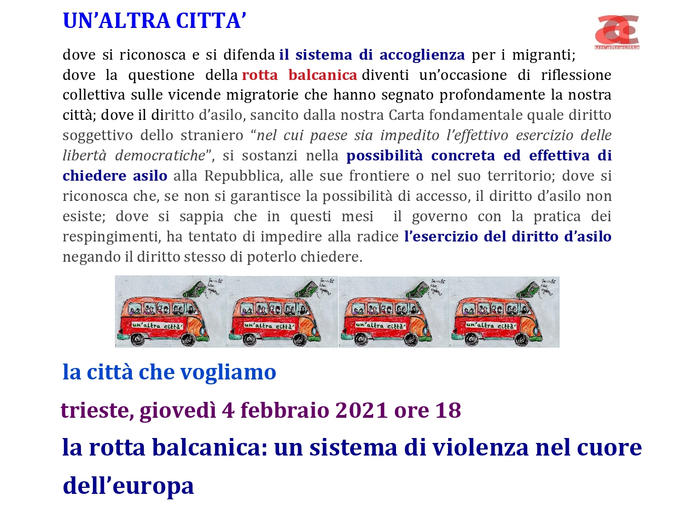 Un’Altra Città, dove si riconosca e si difenda il sistema di accoglienza per i migranti; dove la questione della rotta balcanica diventi un’occasione di riflessione collettiva sulle vicende migratorie che hanno segnato profondamente la nostra città; dove il diritto d’asilo, sancito dalla nostra Carta fondamentale quale diritto soggettivo dello straniero “nel cui paese sia impedito l’effettivo esercizio delle libertà democratiche”, si sostanzi nella possibilità concreta ed effettiva di chiedere asilo alla Repubblica, alle sue frontiere o nel suo territorio; dove si riconosca che, se non si garantisce la possibilità di accesso, il diritto d’asilo non esiste; dove si sappia che in questi mesi il Governo con la pratica dei respingimenti, ha tentato di impedire alla radicel’esercizio del diritto d’asilo negando il diritto stesso di poterlo chiedere.