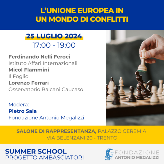 Nell’ambito della Summer School per studenti proposta dalla Fondazione Antonio Megalizzi, un incontro per discutere sulle sfide e prospettive politiche e geopolitiche dell’Unione europea. Intervengono il presidente dell’Istituto Affari Internazionali Ferdinando Nelli Feroci, Lorenzo Ferrari di OBCT e Micol Flammini del Foglio.