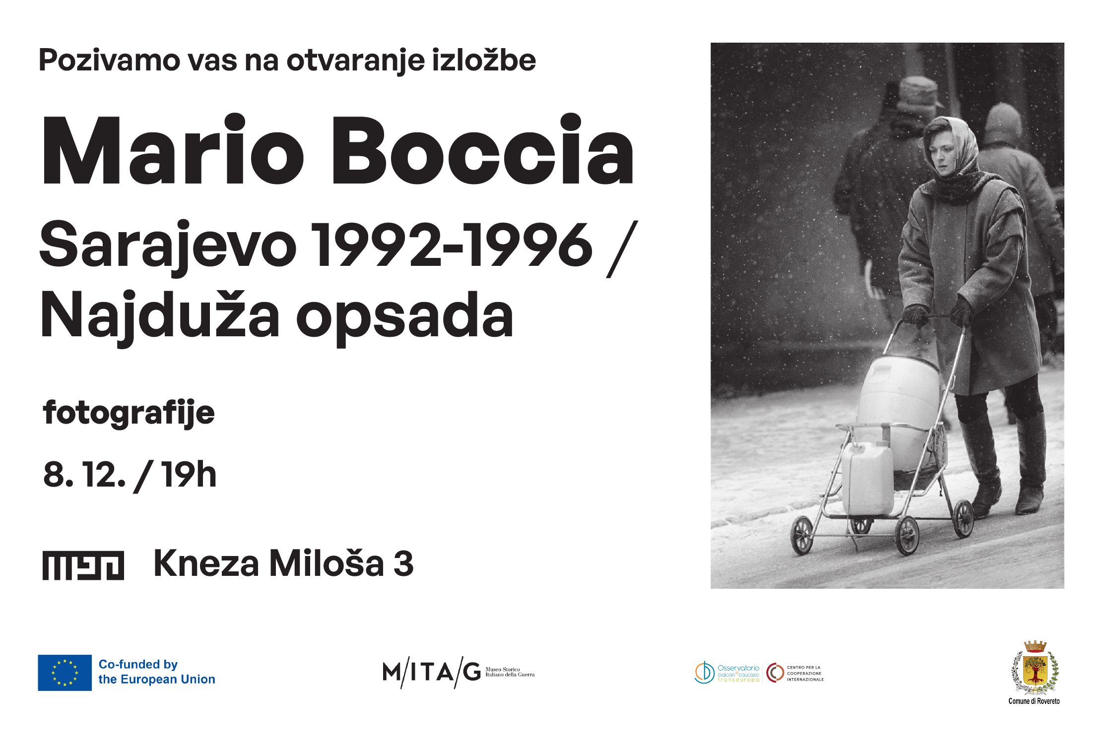 La mostra “Sarajevo 1992–1996 – l’assedio più lungo” di Mario Boccia, realizzata da Osservatorio Balcani Caucaso Transeuropa e Museo Storico Italiano della Guerra, è ospitata presso il Muzej Devedesetih di Belgrado. Le immagini in bianco e nero scattate da Mario Boccia costituiscono un archivio visivo di un’epoca traumatica: la dura quotidianità, segnata da paura e incertezza, vissuta dagli ambitanti di Sarajevo durante gli anni di distruzione della loro città. Queste fotografie non sono solo testimonianza di devastazione e perdita, ma anche di speranza, dignità e dei gesti invisibili di solidarietà che hanno tenuto unita la comunità cittadina.