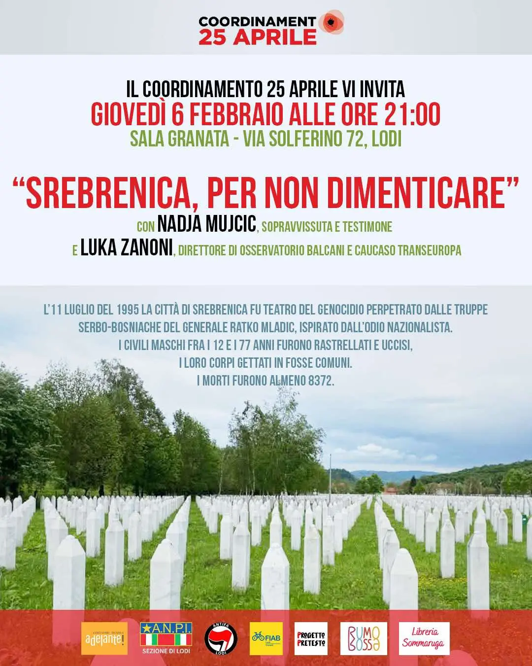 Incontro dedicato alla memoria del Genocidio perpetrato l’11 luglio del 1995 a Srebrenica in Bosnia Erzegovina, dalle truppe serbo-bosniache di Ratko Mladić.